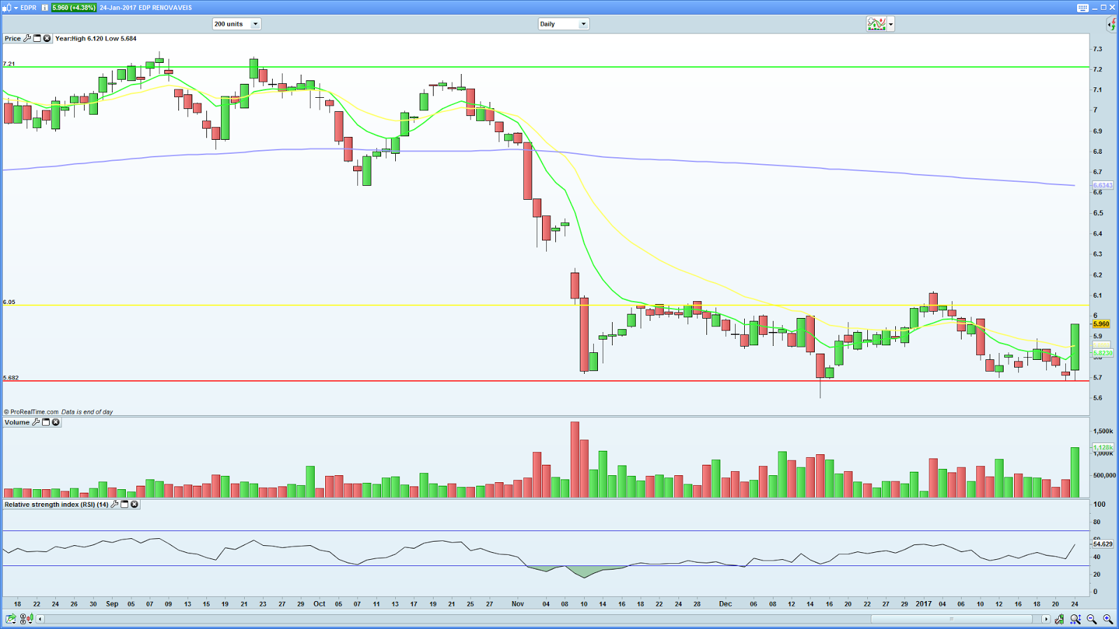 Ao que consegui apurar (e agradeço ao César Borja por ter postado essa informação no grupo do FB) a EDPr teve hoje uma boa notícia vinda dos EUA. Em resumo, temia-se que a administração Trump retirasse os estímulos fiscais concedidos às renováveis de uma forma um tanto ou quanto selvagem e hoje o Secretário de Estado do Tesouro, Steven Mnuchin, acabou por dizer que a coisa vai ser feita com mais parcimónia e até uma certa fleuma. Ora, o mercado esteve este tempo, desde as eleições até agora, em stress, porque toda a gente sabe que, em mercado livre, as renováveis levam retada das petrolíferas e afins e a postura do presidente eleito parecia ser um bocado assanhada. Agora, parece-me a mim que o mercado, esse exagerado, vai começar a comprar a ideia de que andou a... exagerar nas quedas! É isso, meus caros que vejo no gráfico.
