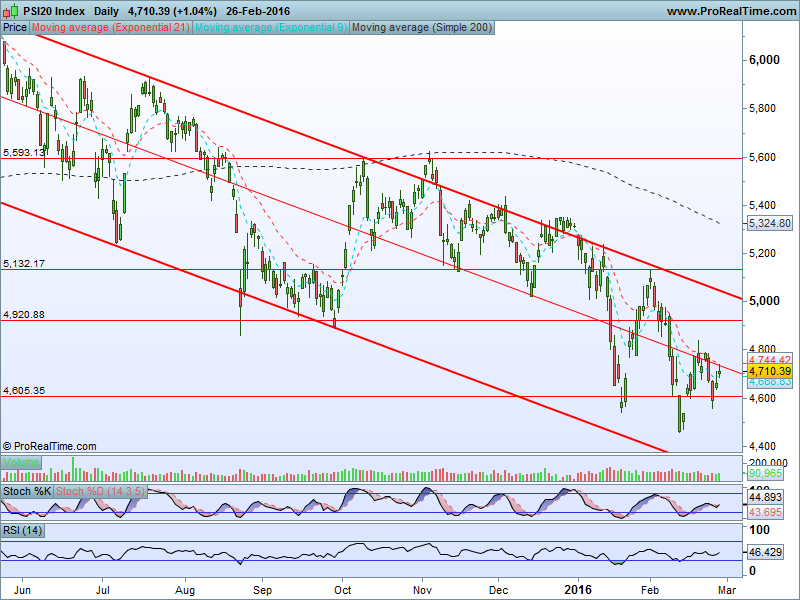 Como os mercados se mantêm em bear market, as resistências devem ser levadas muito a sério, pelo menos num primeiro embate e vai ser importante monitorizar a evolução, por exemplo, do preço do petróleo e da cotação do par euro/dólar para se perceber com que probabilidade poderemos ter uma quebra em alta.