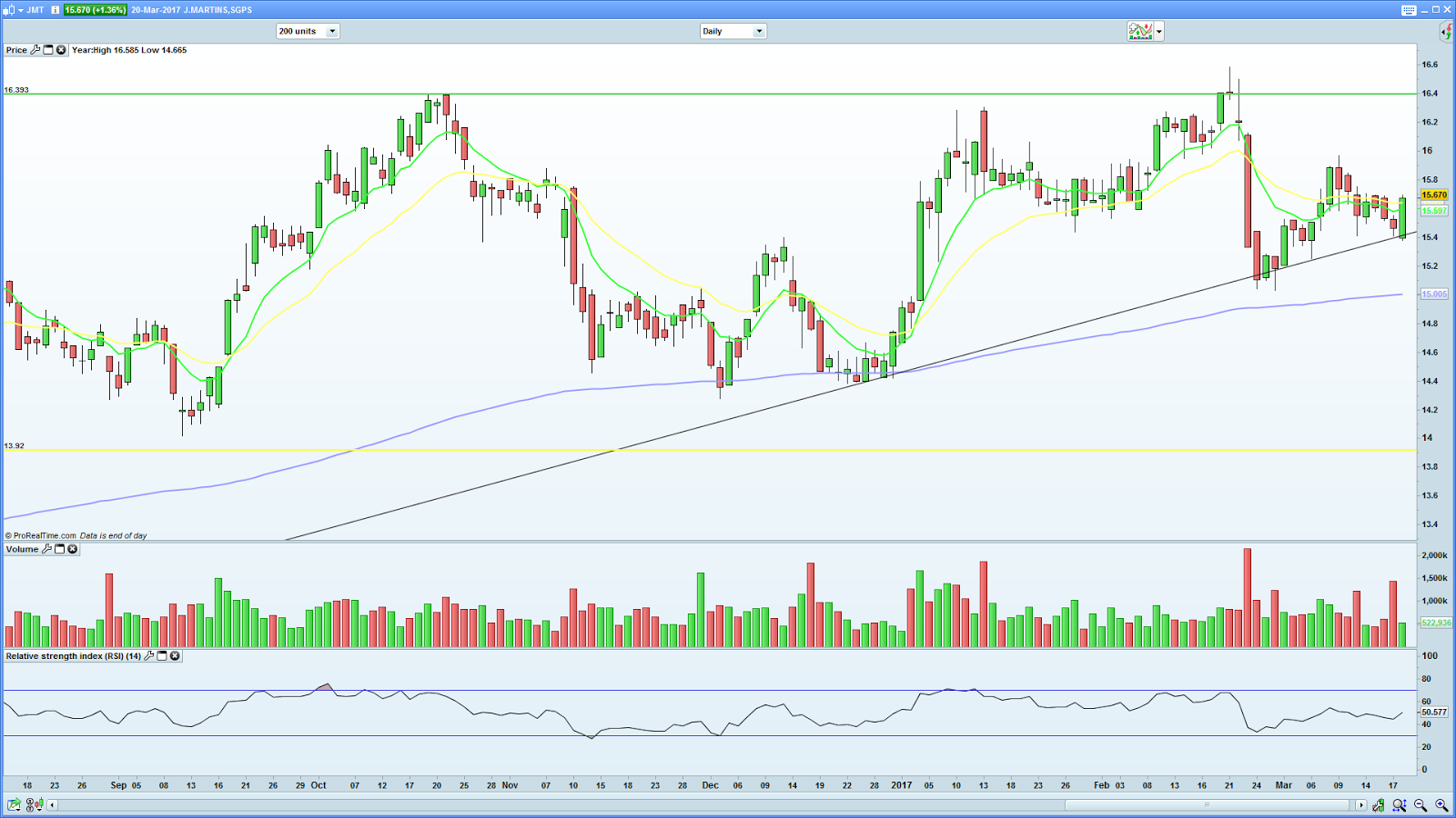 Seja como for, fico contente com o facto de a Jerónimo Martins ter dado sinal de que pode dar um pontapé na crise e, embora não seja o maior fã da empresa, pareceram-me bastante impressionantes principalmente os números da Colômbia, onde pode estar a desenhar-se um cenário de grande crescimento futuro. Se assim for, não tenho dúvidas de que pode estar aí um grande motor para sairmos da cepa torta: é impossível o PSI subir se a JMT (ou o BCP ou a Galp) estiverem em bear market! O gráfico aconselha cautelas no curto prazo, mas creio que poderão estar reunidas as condições para que também esta possa vir a testar a linha vermelha.