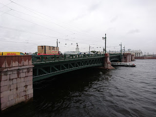 Cá em baixo temos a praça do palácio de inverno e os restantes edifícios do Hermitage, para além dos principais canais da cidade. No tempo do fundador, as pontes foram proibidas por questões defensivas e todos os palácios que a elite ia sendo obrigada a construir dispunham de barco para atravessar os pântanos, mas hoje em dia as pontes são imensas e além da função a que se destinam têm, tal como as estações de metro, uma função estética que o russo muito preza.