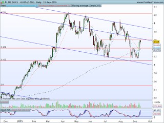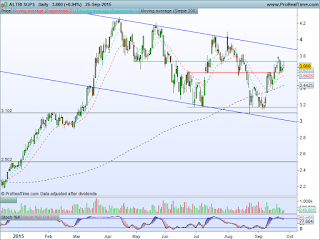Quem esteve atento e aproveitou a reacção na ida ao suporte, sma200, da Altri para encher a carga e seguiu a adenda, pontual e momentânea, na nossa página do Facebook (se ainda não fizeram like, este é o momento) teve como bónus adicional 10% na bagagem ao quarto dia. Com tanta gente a penar por estas semanas corridas, esta percentagem de ganhos neste time frame até parece ofensivo. Mas é a vantagem que se retira de haver um plano e estar atento às oportunidades. Daqui para a frente os 3,60 que foram resistência, mencionada na última análise, viraram suporte que em caso de quebra avista novamente a sma200. Para cima, zona dos 3,74, mencionada na adenda, quebrada em alta e mantemos a ideia da tendência descendente definida por três máximos relativos inferiores a superar.