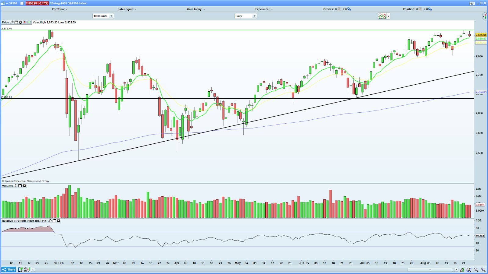 Um duplo topo é um bom exemplo e é um duplo topo que os mais visionários estão a ver neste momento no S&P. Se o índice descair aqui pode haver oportunidade de comprar um bom bocado mais barato, porque muitos vão começar a especular que a figura se vai impor e desatarão a fugir à frente do touro. E é isto, este palavreado todo só para dizer que o mercado está, neste momento, a balançar entre a hipótese fortemente bullish de romper máximos e a desgraça de se começar a desenhar um duplo topo que acabe com a raça do touro.